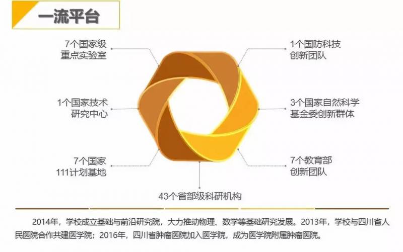 2017年9月,电子科技大学入选国家建设“世界一流大学”高校名单,是36所一流大学建设A类高校之一;未来,学校将通过建设以电子信息为特色的工科、以物理学为代表的理科、以信息技术为支撑的医科,构建协同发展的学科体系,重点建设电子科学与技术学科群、信息与通信工程学科群、计算机科学与技术学科群、信息医学交叉学科群、数理学科群。