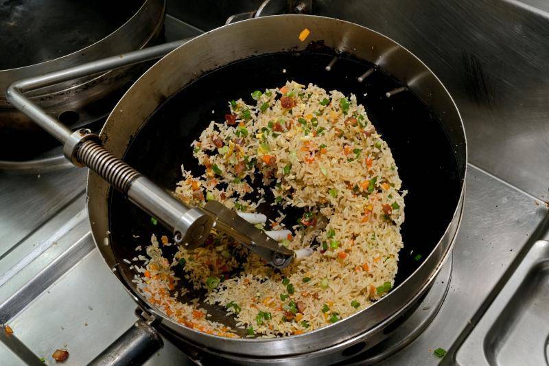 广告餐厅员工只须将食材和调味料加入自动炒饭机所配置的锅中,就可以启动机器进行煮炒。