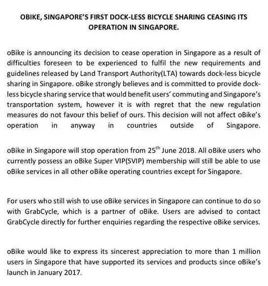 OBike 这是要用车抵押金?突然退出新加坡市场押金成谜!