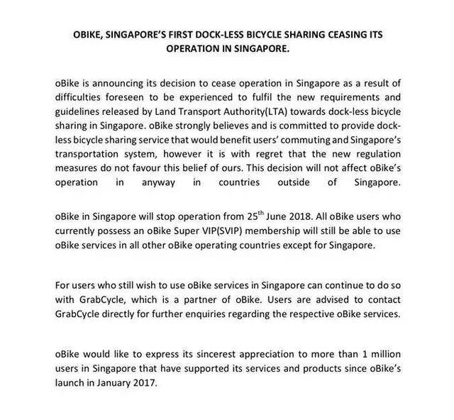 这不还没到7月7日,就已经有共享单车公司顶不住了!共享单车oBike,即日起宣布退出新加坡市场的营业。