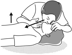 让患者头部后仰,一手将其下颌向上抬起,另一手捏紧患者鼻孔,吸气后紧贴患者口唇,完全包住患者口部,口对口密闭吹气,