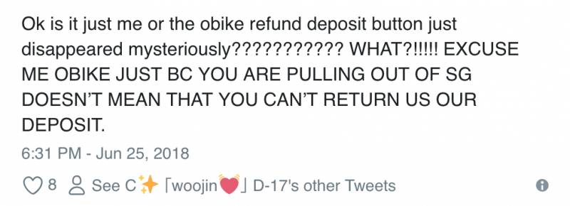 【是只有我的oBike上的“退款”按键神秘消失了吗???拜托oBike!退出新加坡不代表你可以不退押金呀!】