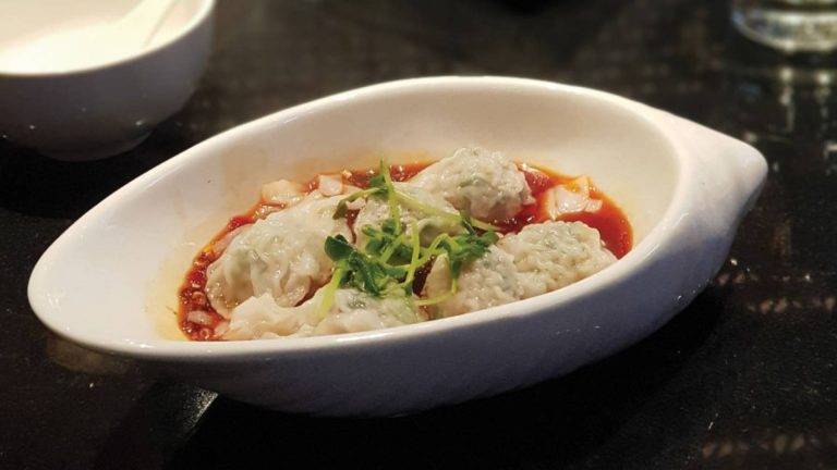 这道“红油抄手”可不一般!它使用的是香港常见的薄皮云吞,里头的蔬菜猪肉馅料几乎可见,