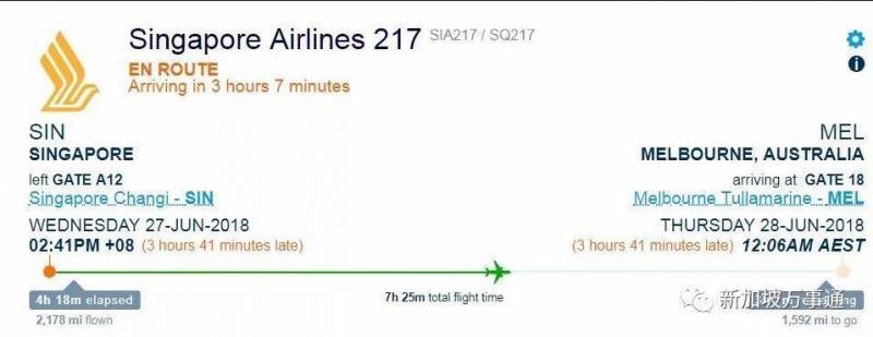 另一架飞机是SQ217,本来定于上午11点起飞前往墨尔本,但在飞机起飞时亮起警示灯,因此还在低速行驶时就取消了飞行。延误了3小时40分钟,飞机上218名乘客最终在下午2点20分乘坐777-300ER离开。
