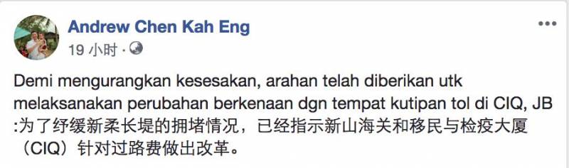 而马来西亚负责新山关卡交通问题的特别小组负责人曾笳恩(Andrew Chen Kah Eng)在脸书上发帖称:“为了纾缓新柔长堤的拥堵情况,已经指示新山海关和移民与检疫大厦(CIQ)针对过路费做出改革。”