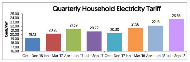 2017年10月至12月,电费为每千瓦时$20.30分,过后调高至今年1月至3月的每千瓦时$21.56分。接着,是今年4月至6月的每千瓦时$22.15分。再然后就是即将来临的每千瓦时$23.65分。