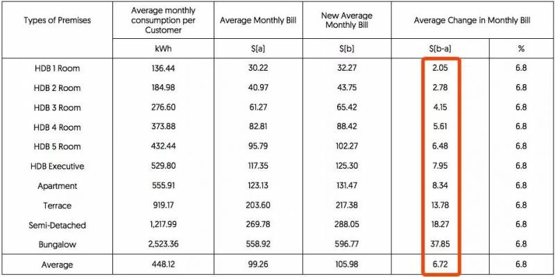具体来说,四房式组屋的家庭平均每月电费将增加$5.61新币!其余房屋类型,请参考下图: