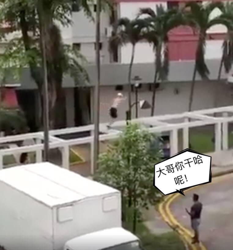这不,有网友目击了一名打着赤膊、戴着鸭舌帽的男子站在遮雨棚的一根柱子上,