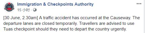 车祸发生后,新加坡移民和兀兰关卡在Facebook 贴文公告,因车祸关系暂时关闭。直到早上8点后,有关路段才重新开放。