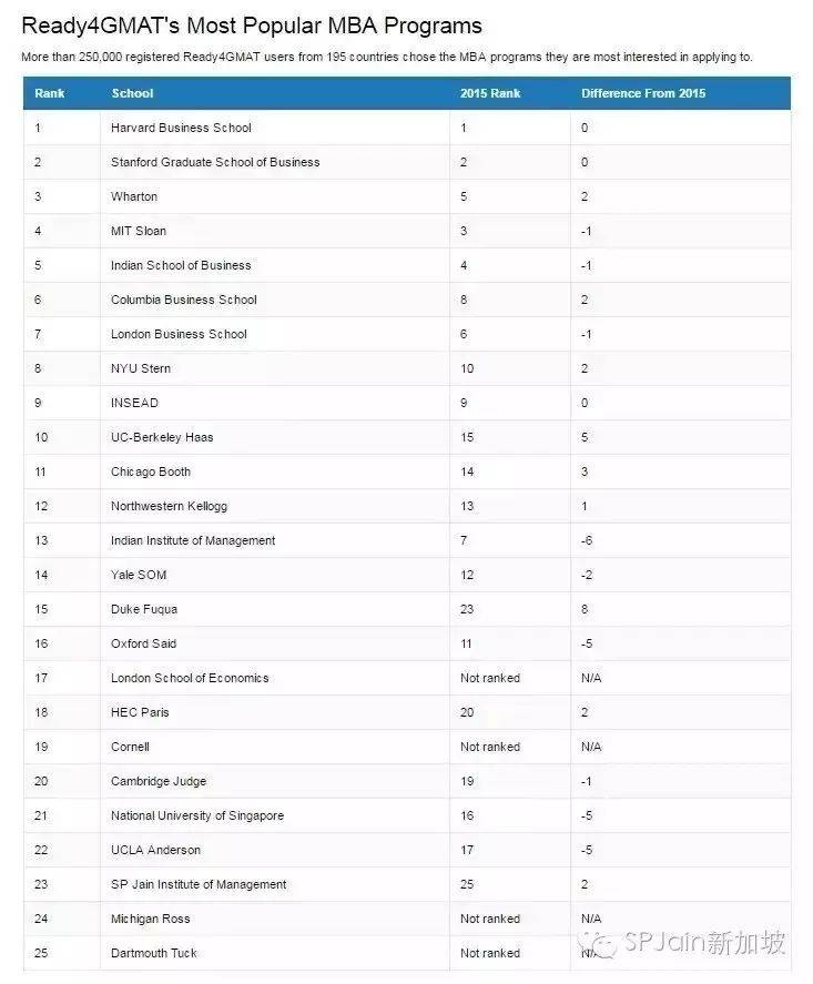 世界最大的GMAT备考网站 Ready4GMAT 2016 评选的全球最受欢迎商学院排名中: SP Jain商学院全球排名23。这份榜单中哈佛商学院独占鳌头,史丹福商学院和宾夕法尼亚大学的沃顿商学院分居二三。亚洲大学中只有新加坡国立大学商学院上榜排名21,SP Jain全球管理学院亚洲第2。