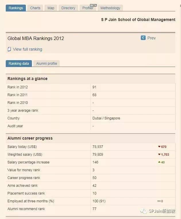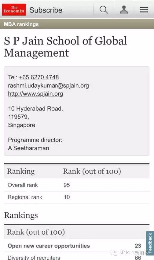 2015年经济学人最佳商学院排名中, SP Jain商学院世界第95,亚洲第10, 但是在毕业生是否在3个月内找到工作排名中,全球第1!毕业生是否通过学校的就业服务排名中, 全球第1!MBA毕业生薪水前后对比涨幅 ,全球第1!