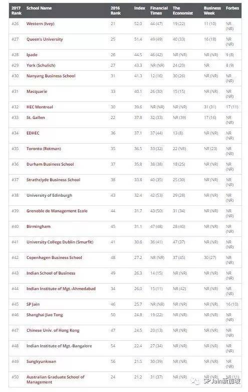 在美国著名商学教育资讯网站Poets&Quants(P&Q)最新公布的2017国际MBA排行榜中,SP Jain 全球管理学院连续第5年入榜, 名列世界45位。在新加坡地区仅次于Insead, NUS 和NTU, 位列第四。在澳洲地区仅次于墨尔本大学和麦考瑞大学,位列第三。该排名综合4大主流权威媒体的排名得出,包括《金融时报》、《经济学人》、《彭博商业周刊》和《福布斯》。