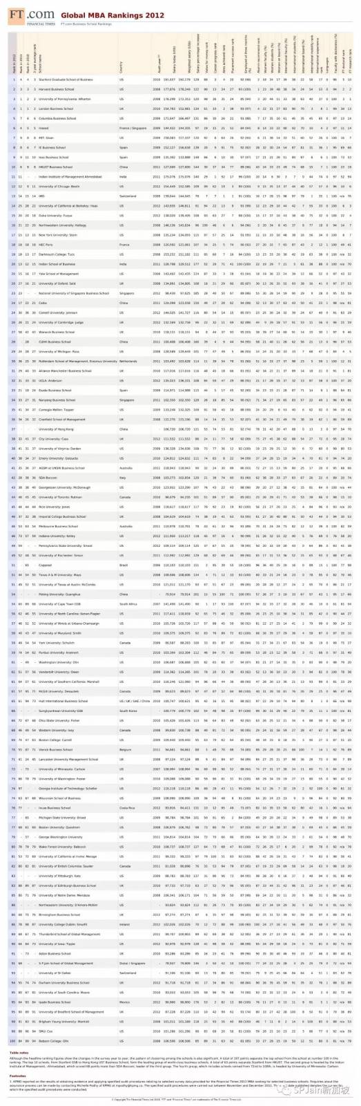 2012年 FT金融时代全球MBA排名中世界第91位。2011年位居世界第68位。