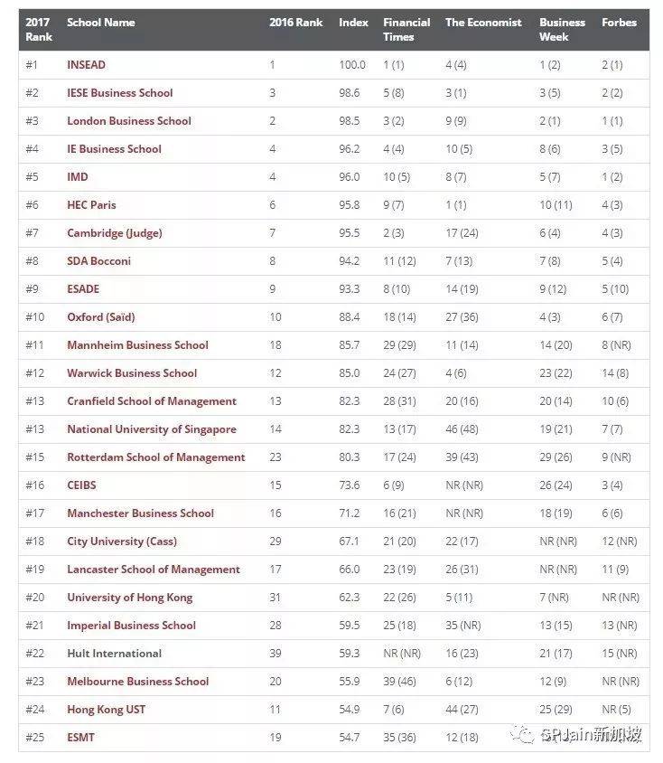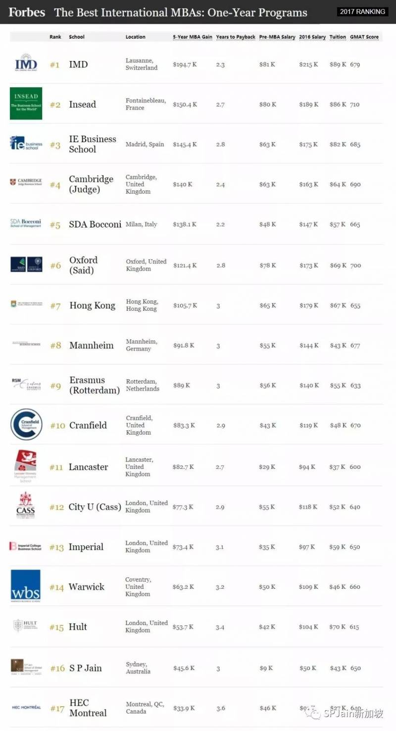2017年9月25日,福布斯Forbes发布2017年世界最佳商学院暨世界最佳1年制MBA课程排名榜单!此榜单罗列的是除美国本土以外的世界最佳商学院排名。
