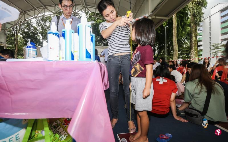 幼儿培育署和淡马锡关怀基金资助的“邻里儿童保健服务”,过去两天在文礼通道举办以弱势孩童为对象的社区体检活动。图为现场的大学生义工为孩童量体重和身高。(梁伟康摄)