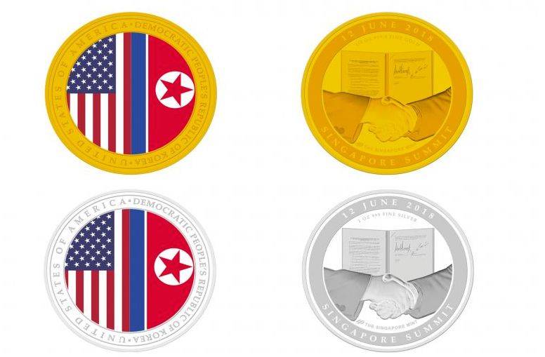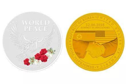 纪念币的一面铸有美国总统特朗普及朝鲜领导人金正恩握住的双手及双方签署的文件。还有美朝峰会日期及“Singapore Summit”的字样。另一面则有两国的国旗和国家名字。