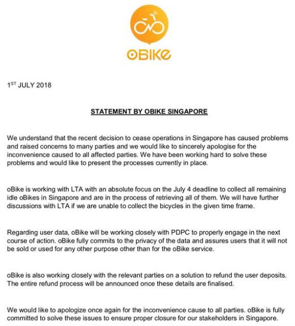 新加坡OBike事件好像看到了曙光!你们的押金有着落了!