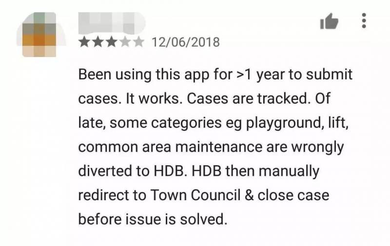 翻译:在几个月前用这APP汇报问题,运作的还不错,案件都可以追踪到最新状况。但比如游乐场问题、电梯问题却发到HDB,而HDB最后用人工手动方式把案子转到Town Council,所以问题还是解决了。