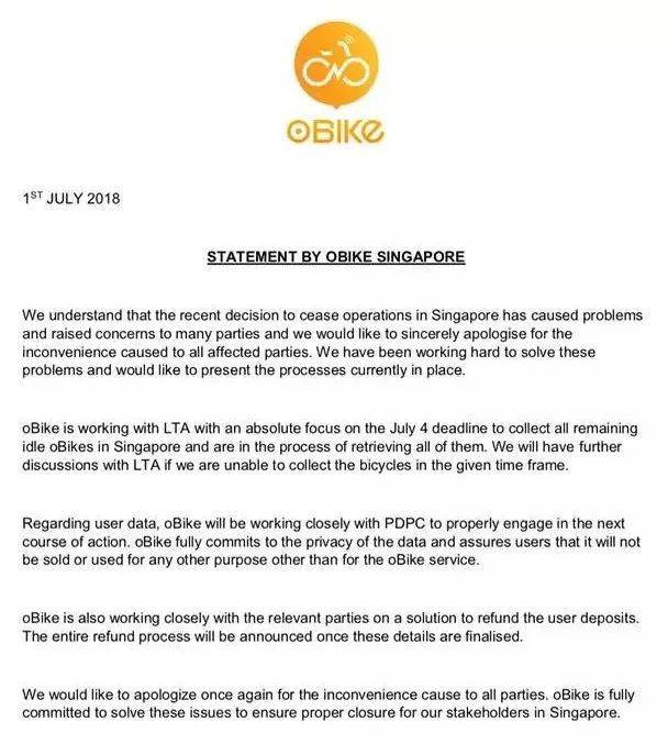 对此,今天oBike终于首次发布声明,正面回答了以上三个问题: