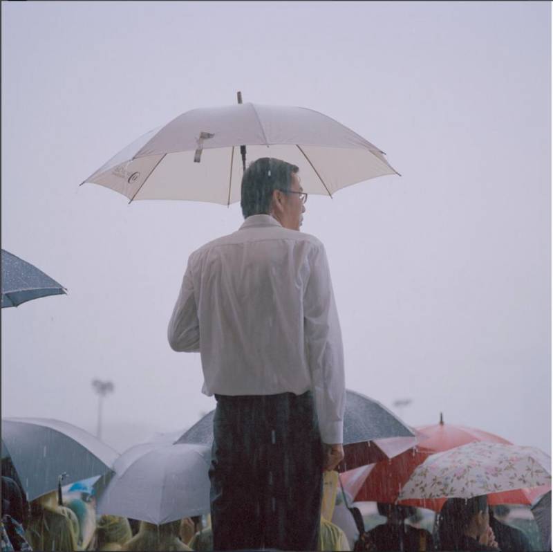 (雨中撑著伞的中年男人,被淋湿的背影即将淹没在人海中。)