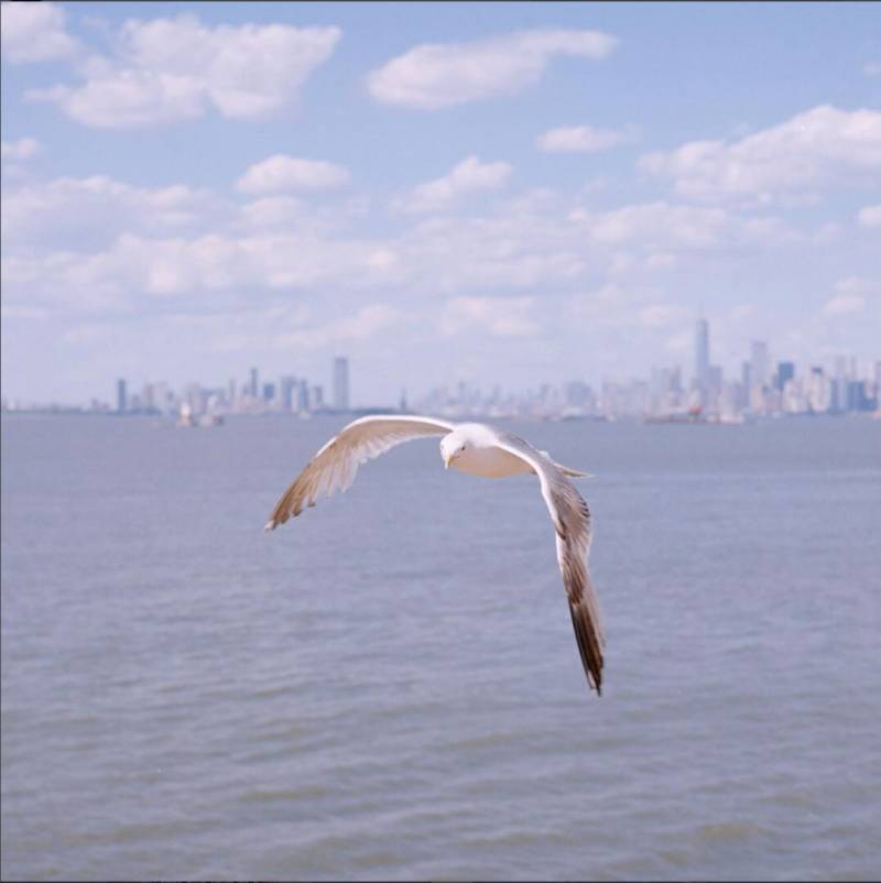 (海鸥飞向远方,海的另一边是我们居住的城市新加坡,一朵一朵的白云停留在城市上空~)