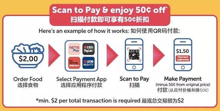 条件是,顾客必须在有参与此促销活动的小贩摊位花费至少$2,并通过银行等电子支付应用程序扫描二维码(QR Code)来支付。扫描付款后,顾客便能享有5毛钱的折扣!