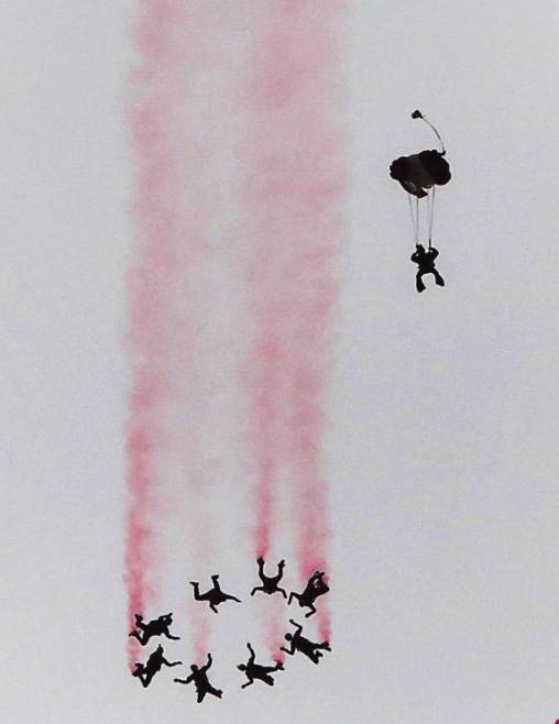军战斗潜水员与红狮跳伞队一同从天而降,