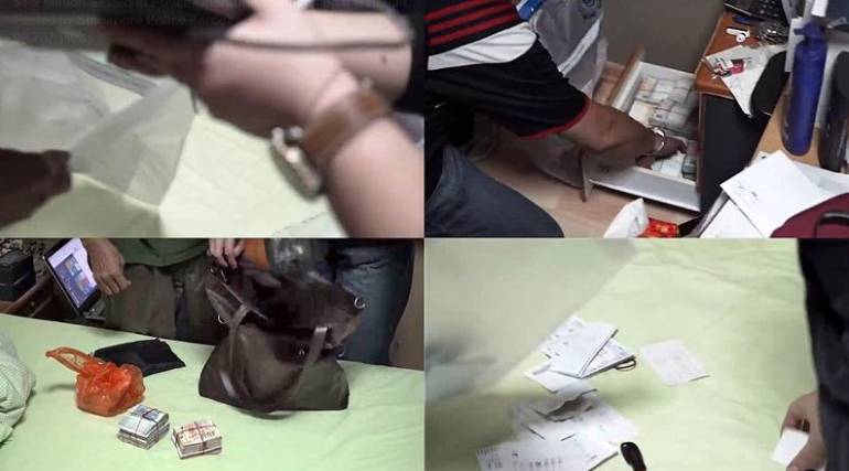画面显示,警方在现场起获大量罪证,包括从抽屉中发现了多卷钞票,