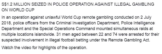 这不,新加坡在世界杯期间就严格整治赌球集团!