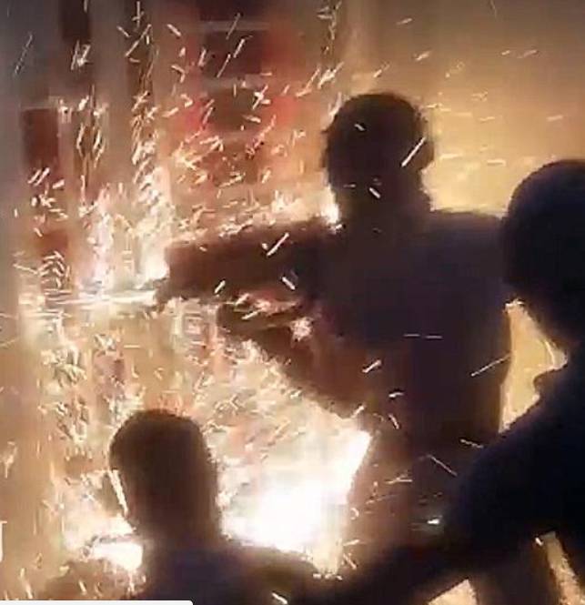 视频显示了四名全副武装、带上保护面具的警员,其中两人手握电锯,迅速锯开铁门,