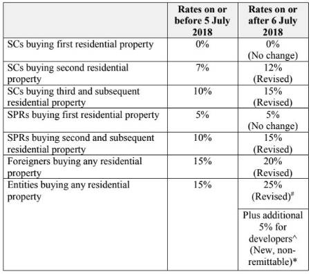 从7月6日起,除了购买第一套房产的新加坡公民和永久居民,其余买家要缴交的ABSD都上调五个百分点。作为企业机构的发展商, 要缴交的ABSD则上调10个百分点。