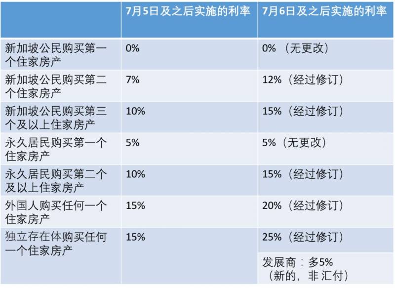 但新加坡公民和永久居民购置第一套住房的额外买方印花税率则不变,依然分别是0%和5%。