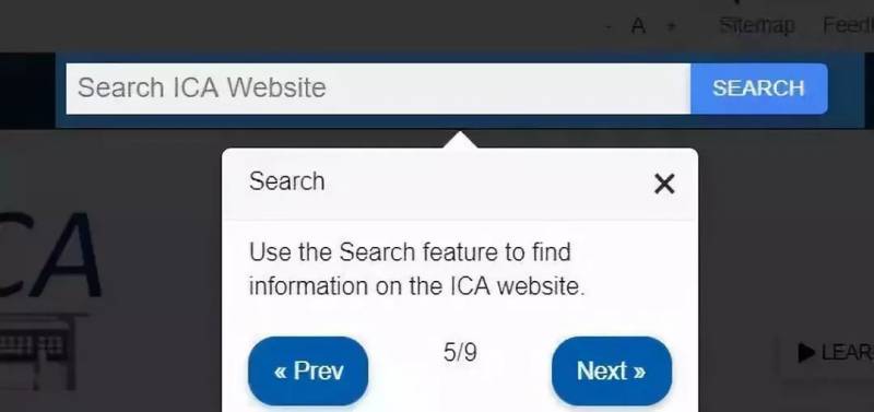 在右上角,使用搜索功能在ICA网站上查找信息。