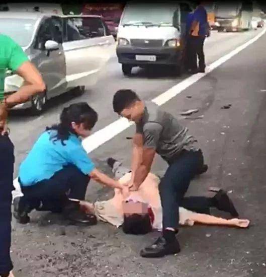 知情者黄先生(45岁,车行员工)叙述,他当时经过事发现场,发现两车相撞后,赶紧下车尝试给予帮助。“三菱车子停在最左边车道,奔驰轿车则侧翻在旁边,后方一辆银色车子的左前方也被撞凹。”死者倒卧路边,一男一女给予救援。(读者提供)