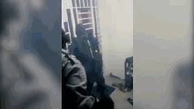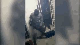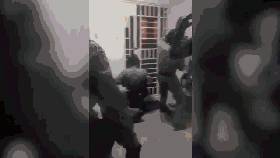 视频中,四名全副武装、带着保护面具的警员,其中两人手握电锯,迅速锯开铁门,声音震耳欲聋,火花四溅。