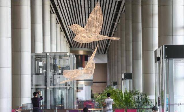 一只在树丛间歇息著,另两只则展翅高飞。名为“羽之灵”(Les Oiseaux),设置在离境厅和抵境厅的三只“飞鸟”雕塑喻意著天与地,梦想和现实的密切关系。