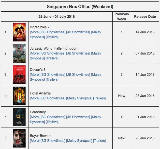 广告小红比较看好的《动物世界》表现不佳,仅仅排在第九,不知是不是因为只上了Cathay,Shaw和WE,在遍布全岛的GV并没有这部片子?反倒是恐怖片《吉屋》排在了第六,看来大伙对练胆还是很喜欢的嘛(点击连结上周影讯)。