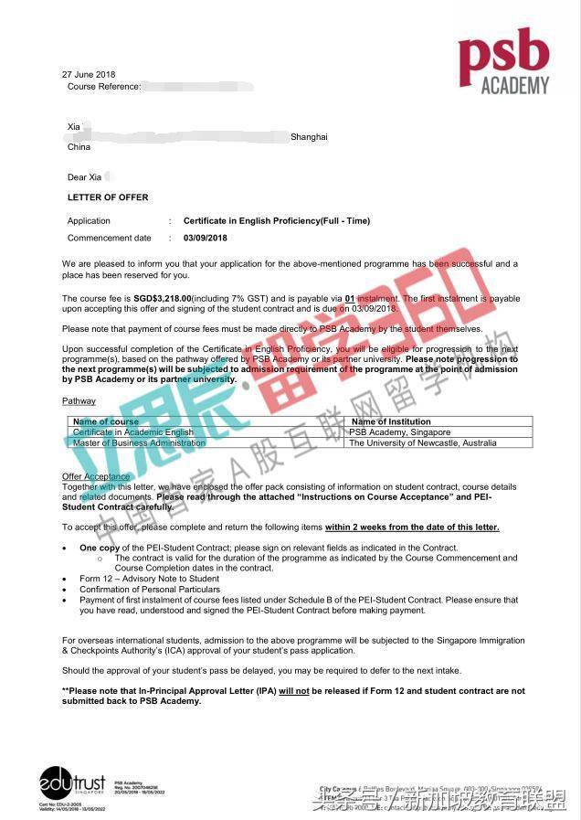 夏同学,上海人,在新加坡已经购房,了解新加坡私立学校的就业情况后,心生向往,打算读完硕士留在新加坡工作,倪老师为其推荐了PSB学院的工商管理硕士,夏同学了解了该课程后,很满意,立马着手办理申请,最终通过与倪老师的配合成功拿下PSB学院的录取OFFER。