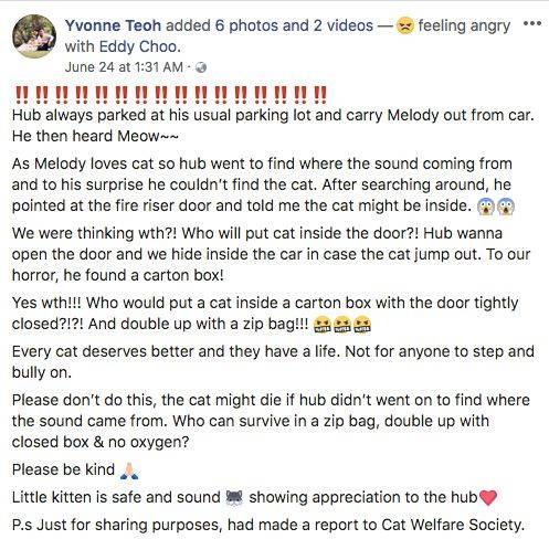 据了解,她的丈夫Eddy Choo与女儿Melody在永光路的一个组屋停车场听到了猫的叫声,并开始寻找那只猫的去处。