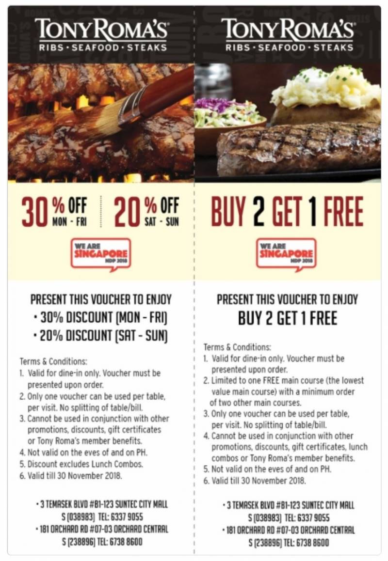 目前烤排骨专业户TonyRoma’s也放出最新优惠券