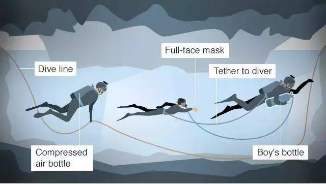 整个过程共出动了90位专业的潜水员,其中40人来自泰国、50人来自其他国家。他们的任务是要引领受困者在几乎全黑的环境下,需要行走、涉水、攀爬及潜水,穿过溶洞险窄通道,并游出洞口。