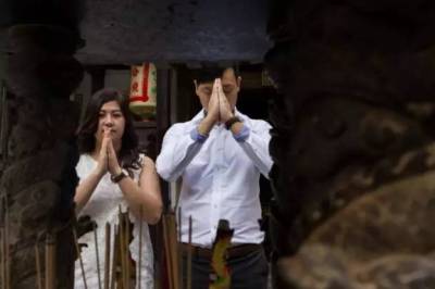 新加坡有一对男女,先后到新加坡历史最悠久的潮州庙宇粤海清庙拜了月老,之后相识相恋。在中秋节,他们竟然回到粤海清庙结婚了。你说灵不灵?