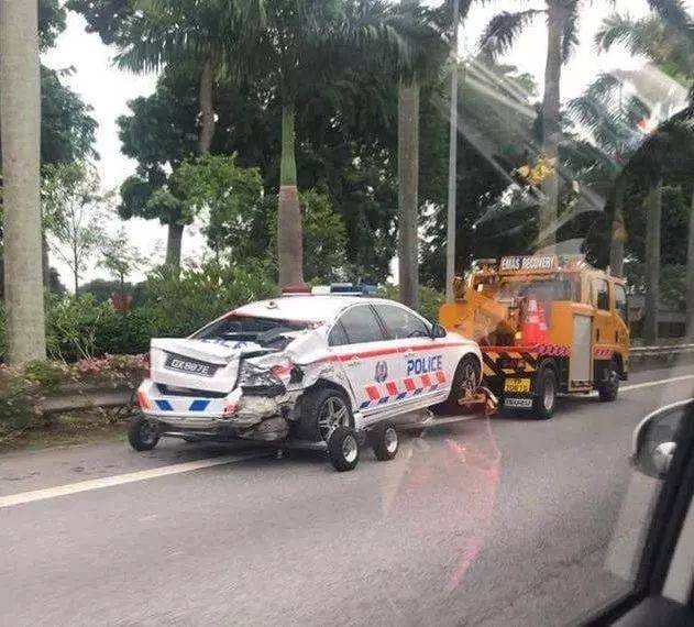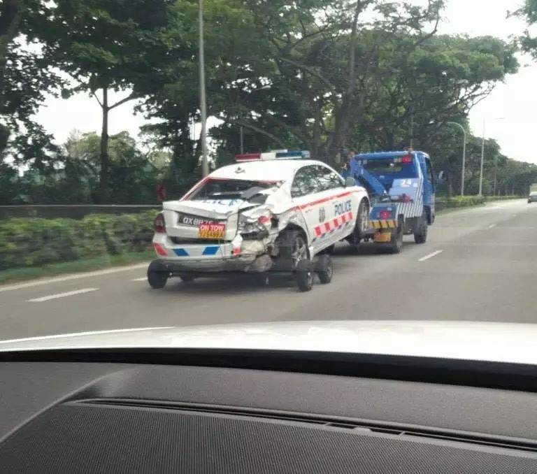 新加坡警方在下午2:57接到报案,随后警车被拖车拖离了现场。