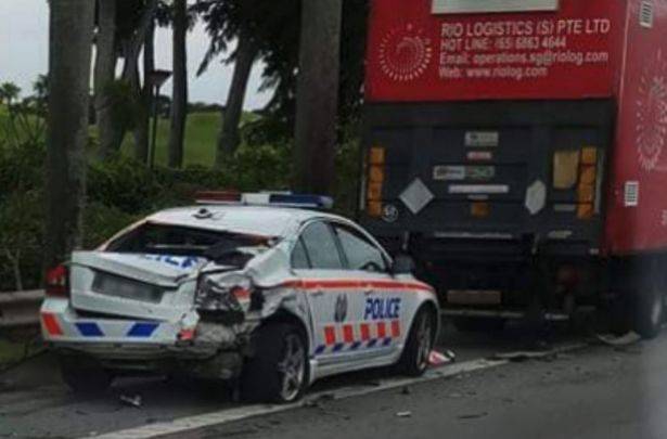 据了解,这起车祸发生在东海岸公园大道(East Coast Parkway)往樟宜机场方向。撞上警车的是一辆大卡车!
