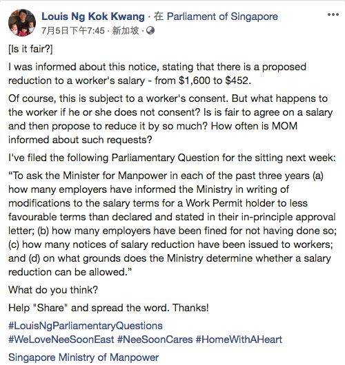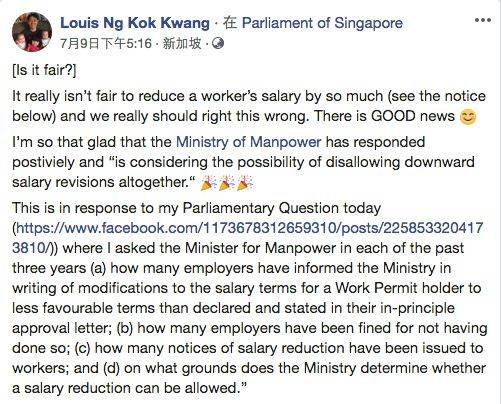 雇主的确有权利调整员工的薪水,或涨或降!但近日,新加坡的一位议员却在脸书上发帖,指出有些调低薪水的做法“不公平”!