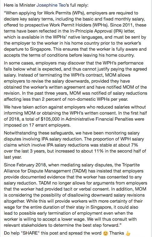 最后杨莉明部长也表示,人力部目前已经在考虑是否要禁止雇主下调持有工作准证的员工的薪资,但这也可能会带来一种后果,即雇主会选择提前解雇员工,即使员工为了保住这份工作而愿意降薪。