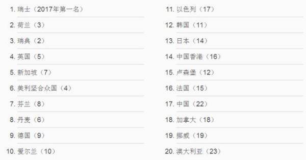 瑞士蝉联榜首,其次是荷兰、瑞典、英国、新加坡、美国等。