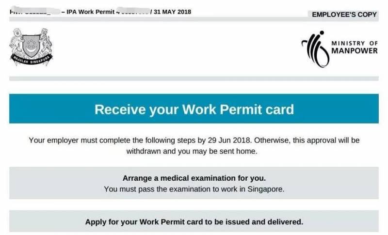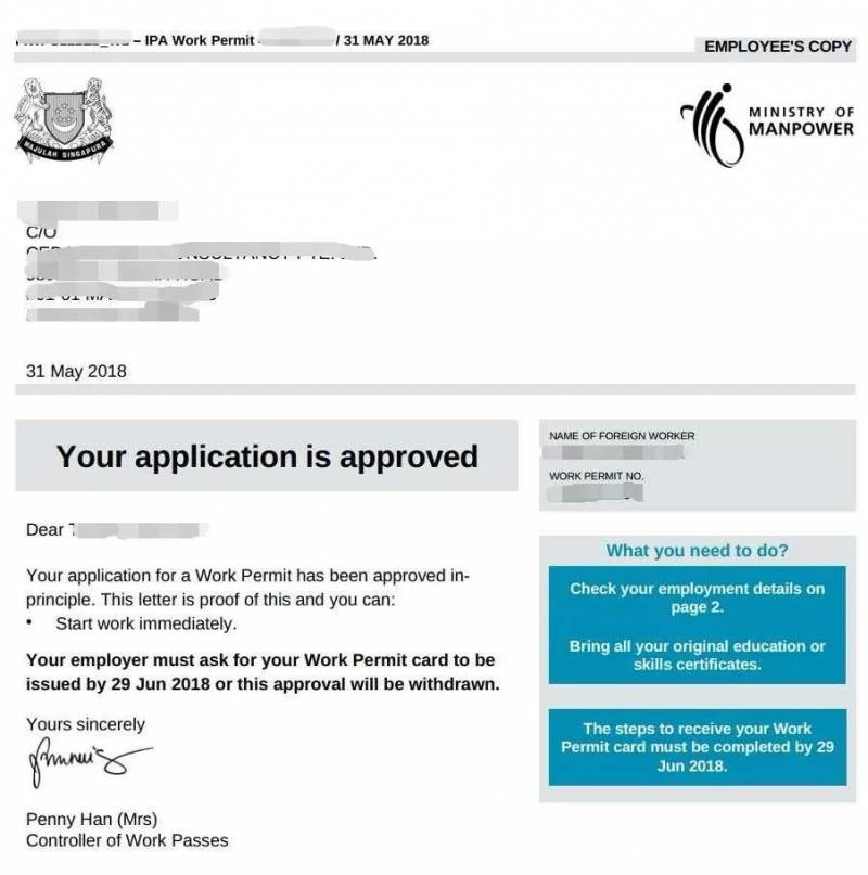 这文件表示WP申请已经批准了,上面有工作证号码(Work Permit NO.) , 和 FIN 的号码 ,如果文件上没有FIN号码记得向公司要,可以在MOM线上查询。