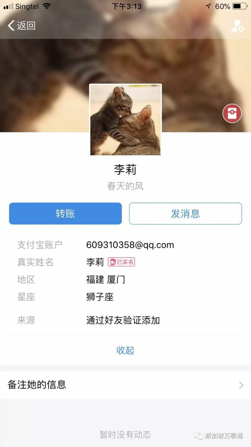 也希望坡岛的各位好心人们能帮帮忙,帮我找到这名女子,目前根据她提供的支付宝账号显示的名字是李莉,英文名:lily,电话号码:82299959,QQ号码:609310358。