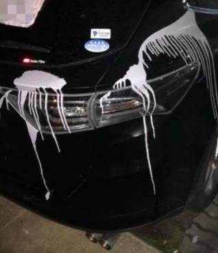 上述汽车大多是车尾和后车座的车门被泼上银色油漆,一些车辆的后车厢扫水器则夹着嫌犯留下的字条。